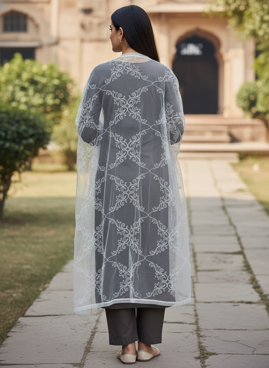 elegant embroidery pattern on net fabric makes it perfect for weddings and occasions. stylish premium dupatta enhancing ethnic outfits with graceful look and lightweight comfort.